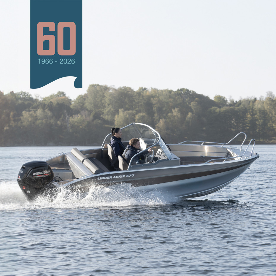 Arkip 570 – en planande motorbåt för 115 hk och 6 personer med dubbelskrov. Ny pulpetlösning med integrerad dörr,