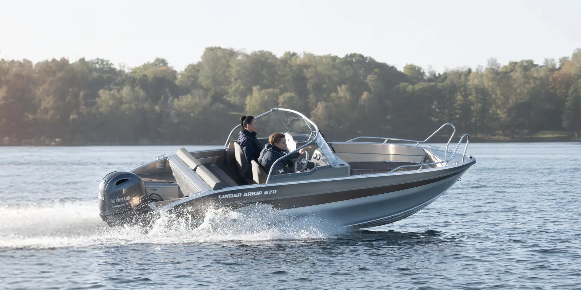 La nouveauté ARKIP 570 est déjà très bien équipée à la sortie d’usine, avec notamment une double console avec porte intégrée, une direction hydraulique, des sièges à amortisseurs, un cockpit auto-videur, une pompe de cale automatique, un réservoir de carburant fixe de 67 litres, une capote arrière, un GPS Garmin avec sondeur, un chargeur CTEK, une housse de console ainsi que des plateformes de baignade avec échelle.Les accessoires seront ajoutés progressivement.